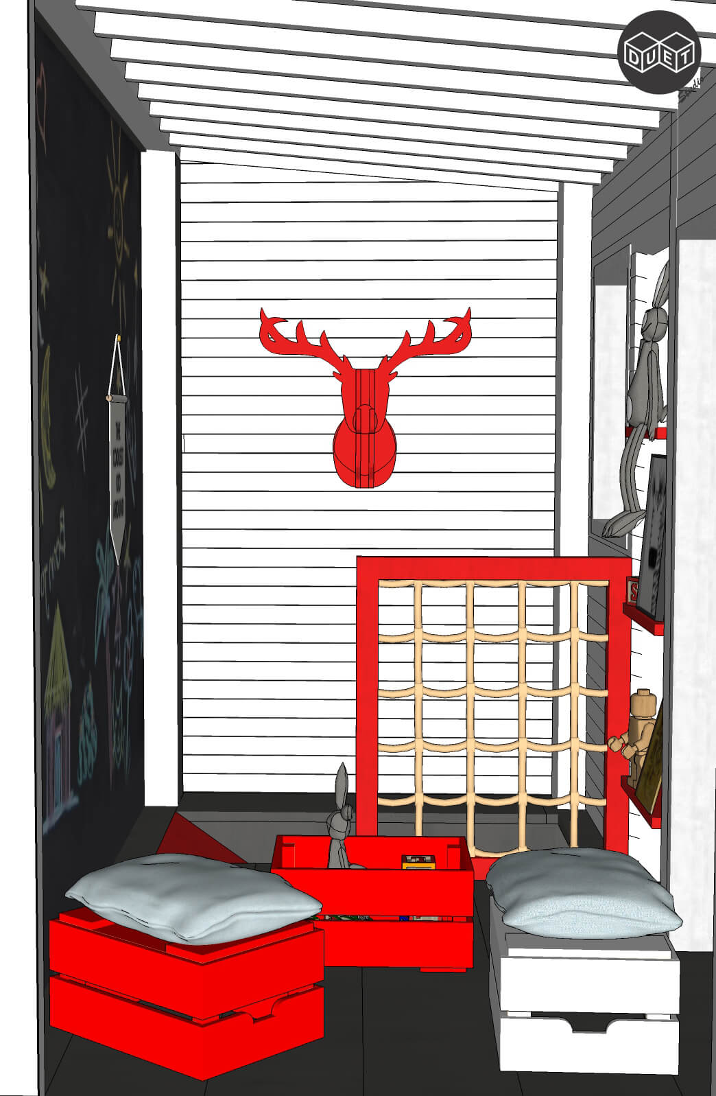 Pewnie wszyscy kombinowaliśmy, aby mieć swój własny kąt, już w dzieciństwie. Ale co zrobić, jeśli na działce nie mamy takiego drzewa, na którym moglibyśmy umiejscowić konstrukcję? Postawić domek na słupach! Tak też zrobiliśmy w tym przypadku. Konstrukcja domku jest drewniana, lekka i oderwana od gruntu właśnie za pomocą słupów. Taki zabieg uatrakcyjnił prostą formę domku i na pewno sprawi więcej frajdy użytkownikom. Do domku można wejść za pomocą pochylni, mini ścianki wspinaczkowej lub przez okno- po konstrukcji z siatki (opcja dla starszych dzieci). Kolorystyka jest spójna- spokojne szarości i biele przełamano energetyczną czerwienią. Bryła jest niewielka, ale funkcjonalna.